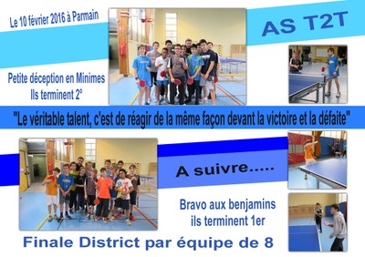Le mercredi 10 février 2016, deux équipes (une équipe de benjamins et une équipe de minimes) de Notre Dame de la Compassion issues des qualifications du sous district de Pontoise se sont déplacées à Parmain pour la compétition district par équipe de 8. Les benjamins ont été très forts, ils terminent 1er et sont qualifiés pour la finale départementale prévue le 18 Mai à Goussainville. L’équipe des minimes se classe deuxième après une défaite de 1 point lors du dernier match. Déçus, les minimes espèrent être repêchés et relever le défi lors de la finale départementale.