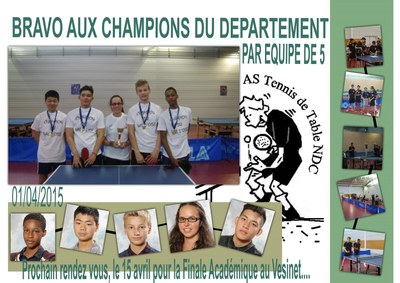 Le 1er Avril 2015, les 12 meilleures équipes du Val d’Oise se sont retrouvées à Ezanville pour conquérir le titre de champion départemental en 4 + 1 (formule composée de 4 joueurs dont une fille et un jeune officiel). Les rencontres qui se jouent en deux sets sont arbitrés par des jeunes officiels. 7 d’entre eux étaient de NDC dont Théophile (élève de 4ème à NDC) qui n'en est pas à ses premières rencontres. En effet ; il a obtenu l’an passé la validation Nationale et apparait comme un arbitre chevronné et respecté. Ce qu’il aime, c'est d'arbitrer de bons joueurs pour s'inspirer de leur niveau de jeu. Tout comme Théophile, Julien (élève de 6° à NDC) qui arbitre pour la première fois, trouve cela intéressant car arbitrer lui permet d'apprendre parfaitement les règles pour ne plus faire de fautes lorsqu’il joue.