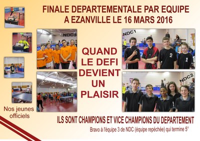 Le 16 mars 2016, a eu lieu la finale départementale par équipe de 4 à Ezanville. Motivés comme jamais, nous sommes partis à 12h30 pour essayer de gagner le titre de « champion du Val d’Oise » en équipe d’établissement. Qualifiées à l’issue des finales districts, NDC1 et NDC2 sont rejoints par NDC3 qui a été repêchée suite au désistement d’une équipe de Courdimanche. Après des matchs tendus et très serrés pour certains, NDC1 et NDC2 se qualifient pour les ½ finales. Si NDC1 gagne sa rencontre assez facilement contre l’équipe de Jouy le Moutier, NDC2 gagne de justesse par 3 victoires à 2. De son côté, NDC3 (Hippolyte S, Ruben L, Florian G, Alixe M, Renzo P) termine par une victoire contre l’équipe d’Ezanville et se classe cinquième sur les 12 équipes présentes.