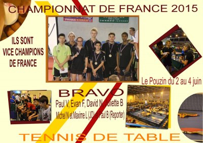 Le Mardi 2 juin à 9h20 dans le gymnase de NDC un groupe d’élèves se regroupe. Il s’agit de l'équipe de Tennis de Table de notre collège qui se prépare pour vivre une expérience UNIQUE, le championnat de France de Tennis de Table UNSS qui se déroulera en Ardèche, (Le Pouzin ) du 2 au 4 juin 2015. C’est vers 16h00 que l’équipe « débarque » au Pouzin. Ça y est, l’équipe de NDC va savoir si elle est capable de rivaliser et de répondre à cet évènement si sélectif, le championnat de France COLLEGE !