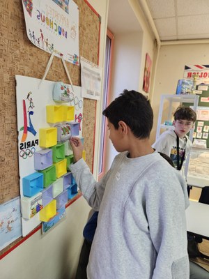 Le calendrier de l’Avent a pour thème les JO. Nous avons tous pioché 2 étiquettes sur lesquelles étaient notés des numéros jusqu’au 24. Chaque jour, nous posions une question en lien avec cet événement et ainsi nous avons appris plein de choses !