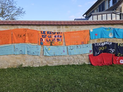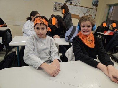 A cette occasion, chaque élève s’est rendu dans sa classe pour recevoir un bandana d’une couleur par niveau (jaune, pour les 6èmes, orange pour les 5èmes, rouge pour les 4èmes et bleu pour les 3èmes). Ensuite tous les élèves se sont répartis sur les cours de l’établissement.