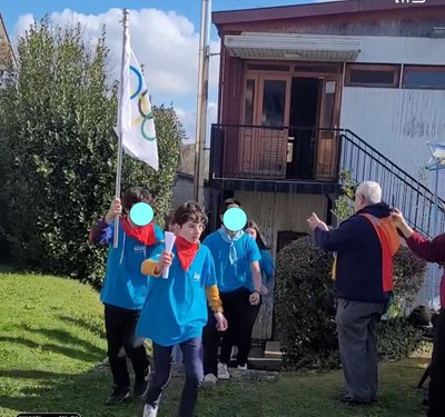 Nous avons commencé par un blind test : il fallait reconnaitre le titre de chansons en lien avec le sport. Après, un défilé des bannières tenues par les délégués de chaque classe mettant en valeur des mots sur les JO a eu lieu sur la cour.