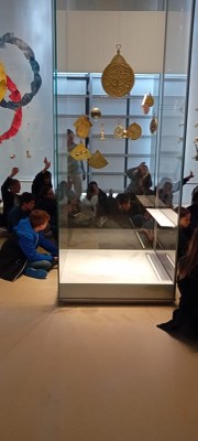 Ensuite, nous avons mangé. Puis nous sommes allés à pieds au musée. Sur place nous sommes passés par l’arène. Un guide nous a fait visiter ce monument dans lequel nous avons vu des livres très anciens écrits en arabe. Nous nous sommes entrainés à écrire notre prénom au stylo en forme de bambou, avec de la peinture. Cet accompagnateur a écrit notre prénom en arabe et nous nous sommes entrainés à le recopier. Le guide nous a montré des pierres de l’ « époque avant Jésus Christ ».