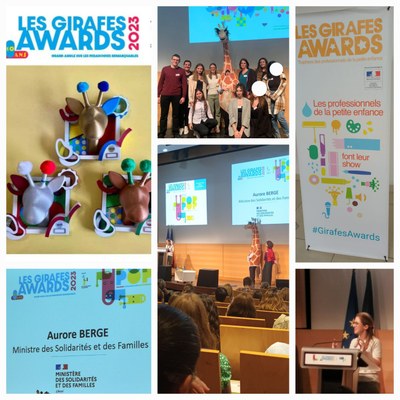 Le concours Girafe Awards récompense des initiatives au niveau de la petite enfance (structure collective, individuelle mais également un prix lycéen). Le thème était POP à interpréter et développer selon le prisme de chacun. La classe de CAP 2ème année a participé en 2023 et le projet a été sélectionné même si malheureusement nous n’avons pas reçu le prix. Néanmoins, nous nous sommes rendus au ministère pour participer à la journée de remise des prix, une expérience enrichissante pour chacun.